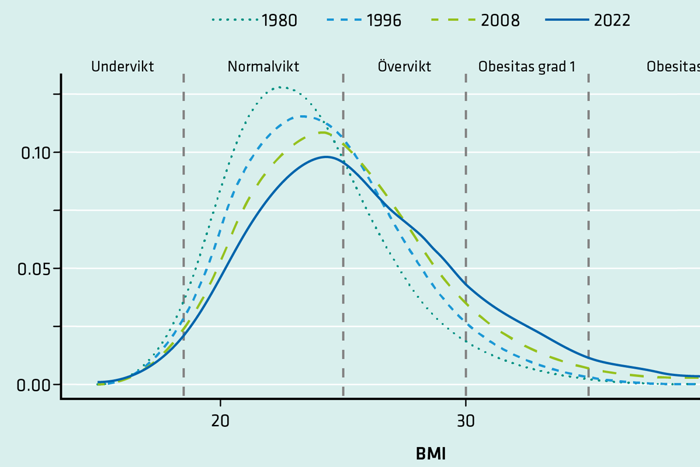 Rapporten presenterar analyser av befolkningens viktutveckling under 1980–2022.