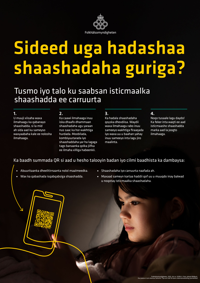 Publicerad:Affischen på somaliska riktar sig till vårdnadshavare och presenterar tips och råd för barns och ungas skärmanvändning.