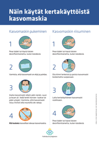 Publicerad:I denna affisch på finska visar vi hur du använder munskydd på ett korrekt sätt. Rätt använda kan munskydd vara ett komplement till övriga riskreducerande åtgärder för att hindra smittspridning.