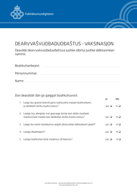 Denna blankett på nordsamiska kan användas av regionerna i samband med vaccination. Den kan fyllas i digitalt och skrivas ut på papper.