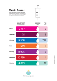 Affischen Vaccin funkar illustrerar nyttan med det allmänna vaccinationsprogrammet för barn i Sverige, med sju av sjukdomarna som exempel. Bilden visar hur många personer som rapporterades ha sjukdomarna året innan allmän vaccination började erbjudas mot dem, jämfört med antalet rapporterade fall 2025.