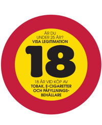 18 år vid köp av tobak, folköl, e-cigaretter och påfyllningsbehållare (125 mm)