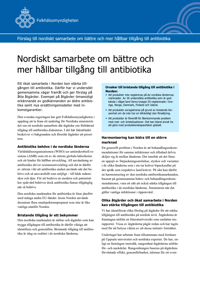Publicerad:Folkhälsomyndigheten föreslår prioriterade åtgärder för att stärka tillgången till antibiotika som är lämpliga för samarbete på nordisk nivå. Ett nordiskt samarbete skulle kunna stärka tillgången till befintliga antibiotika.